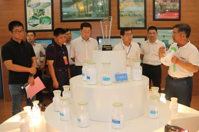接着,考察团参观了科隆公司展厅。 陆元鸿说,7月10日是科隆公司24岁生日,在科隆公司过24岁生日不久迎接各位领导和嘉宾的到来,是公司的荣幸。公司在重质碳酸钙行业深耕细耘20余年,获得了“国家高新技术企业”、“中国碳酸钙行业重钙十强”、“全国五一劳动奖状”、“国家知识产权优势企业”和“广西重质碳酸钙工程技术研究中心”等殊荣,参与了《碳酸钙分析方法》等国家标准及《工业用重质碳酸钙》等行业标准的制定。产品广泛用于人造石、造纸、涂料、橡胶、塑料、油墨、建材及日用化工等行业。重质碳酸钙在各行业上主要是作为绿色环保填充料使用,它是目前最廉价的白色填充料,主要作用一是降低产品成本,二是改变产品性能。