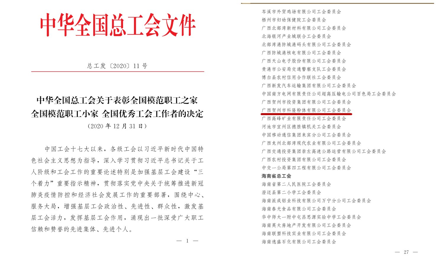 广西贺州市科隆粉体有限公司工会委员会获中华全国总工会表彰
